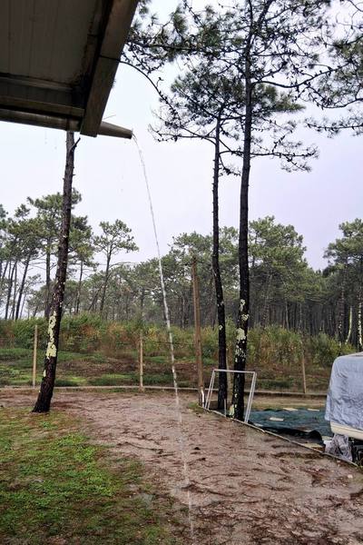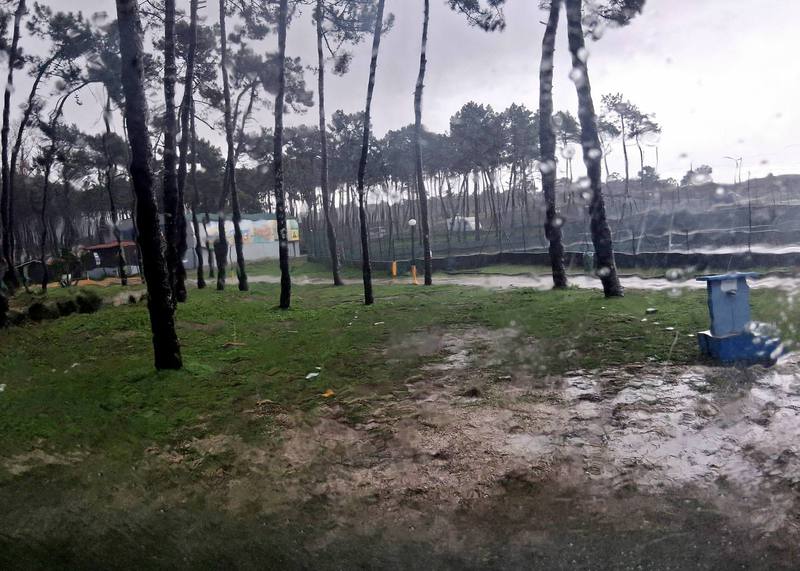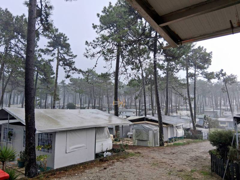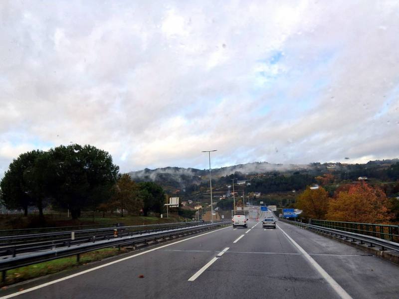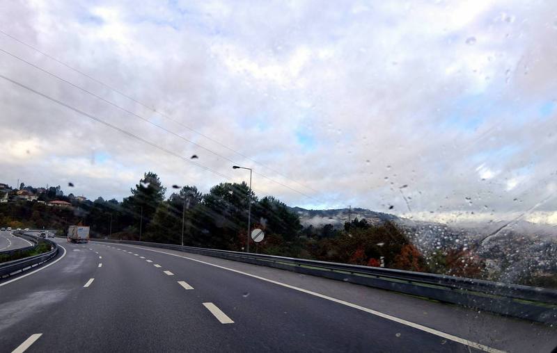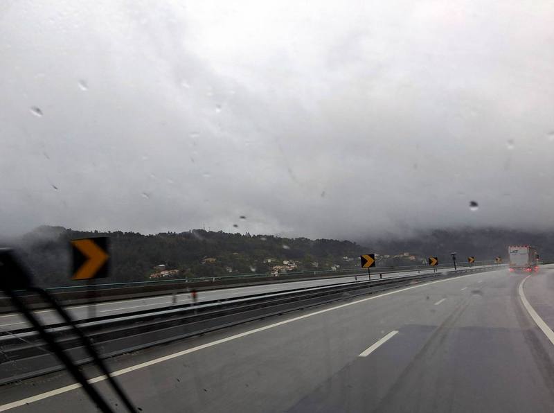 Die Nacht ist der Horror, Gewitter und Starkregen halten uns wach. Morgens schaffen wir es gerade, das Stromkabel zu lösen, ohne im Wasser zu versinken. Die Fahrt durch Vila Real ist chaotisch, jede Menge Einbahnstraßen. Als wir es endlich geschafft haben, die Autobahn zu erreichen, „schwimmen“ wir wieder durch die Berge und um Porto herum. Irgendwann lichten sich die Wolken, wir kommen allmählich zur Küste.