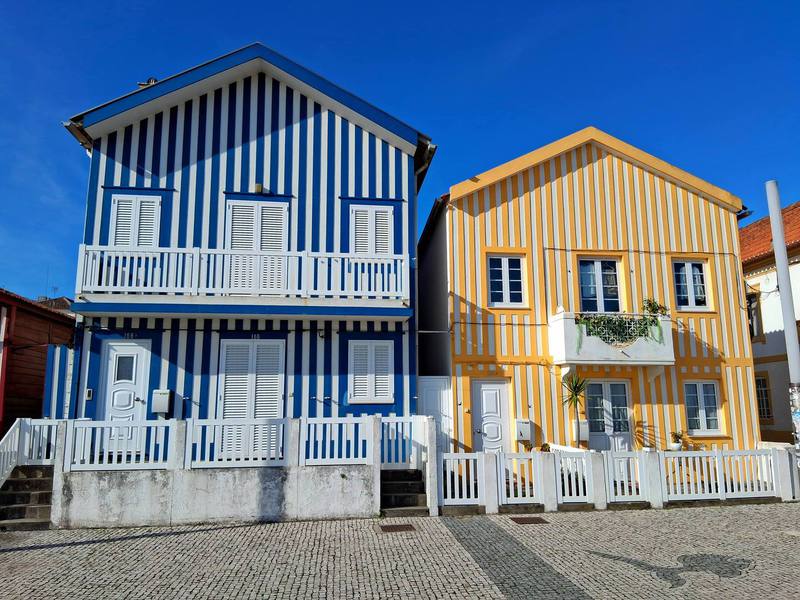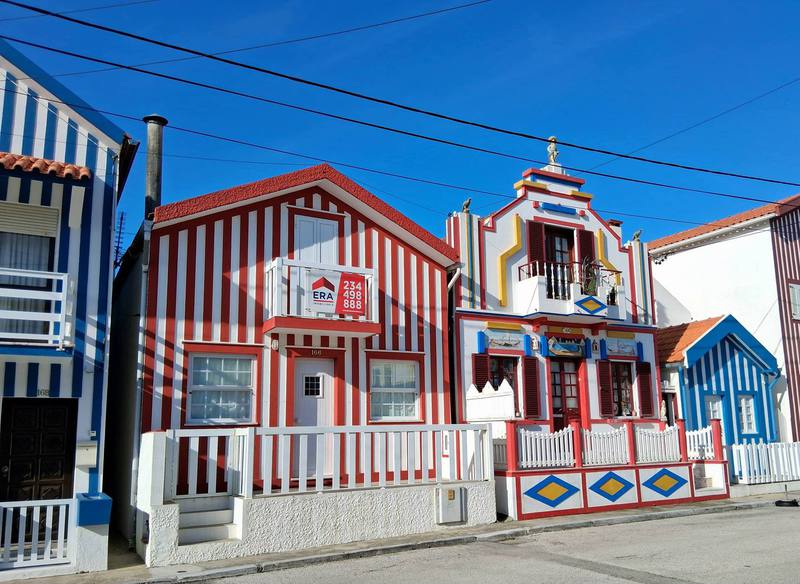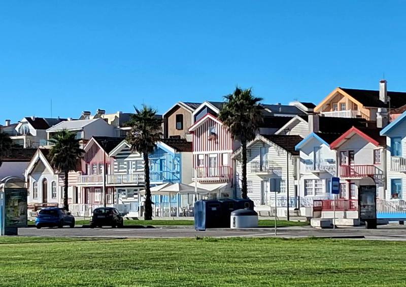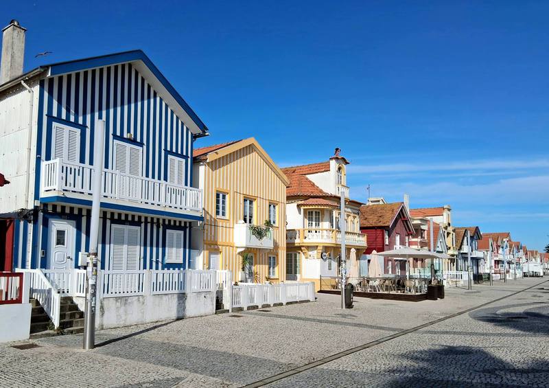 Dann erreichen wir das Dorf Costa Nova do Prado mit wunderschönen Häusern. Der Radweg ist erstklassig und geht später in eine Schlaglochstraße und Schotterpiste über. Aber da es keinen Verkehr gibt, genießen wir die herrliche Seenlandschaft, die viele verschiedene Vögel beherbergt.